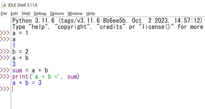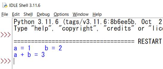 変数の和「a + b」を求めるスクリプトを実行すると、その値が表示される。しかし、和を変数sumに代入する式「sum = a + b」の実行の場合は、sumへの代入が実行されるだけで、変数sumの値は表示されない。表示させるために関数printを用いる。スクリプト「print(‘a + b = ‘, sum)」を実行すると、「a + b = 」に続けてsumの値が表示される。文字列は、引用符 ‘ で囲んで表す。関数printで表示するものは、コンマ , で区切って並べる。文字列はそのまま表示され、数値を表す変数はその値を表す文字列が表示される。