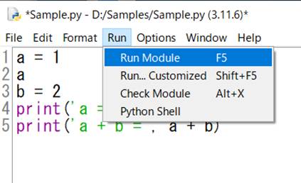 スクリプト モードのときは、変数名を「a」と書くだけ(図D.5の2行目)では、変数の値は表示されない。表示するときは、関数printを用いる。図D.8の出力では、図D.5の2つのprint関数「print(‘a = ‘, a, ‘ b = ‘, b)」と「print(‘a + b = ‘, a + b)」によって変数aとbの値、および式a + bの値が表示されている。
