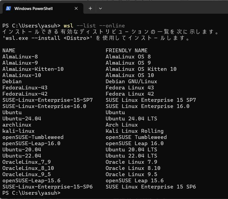 上のリストにある「Ubuntu-24.04」をインストールするときは、コマンド