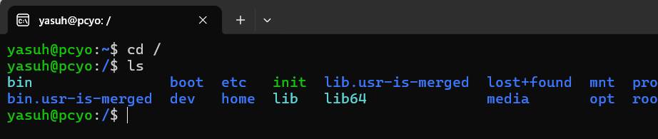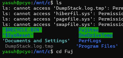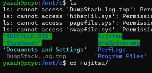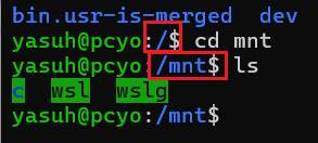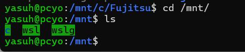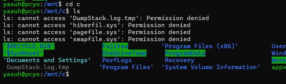 コマンドlsで表示されたリストに小文字cで表されているのが、WindowsのCドライブである。