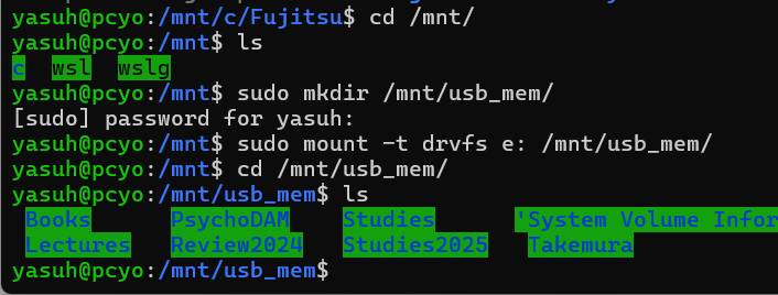 先頭の「sudo」は、以下のコマンドを管理者権限で実行することを意味する。オプション –t drvfsが必要である。Windowsのドライブ名は、例えば、E:である。E:を指定すると、ドライブE:がマウントされるが、ドライブ名は小文字を用いる。E:ドライブであればe:である。