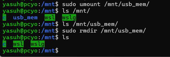 アンマウントしても、ubuntuのディレクトリusb_memは残っている。このディレクトリも削除するときは、rmdirコマンドを用いる。図B10 に、例を示す。