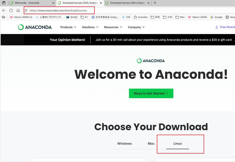 ウェブサイトの指示に従って、Minicondaのダウンロードのウェブサイトに進む。