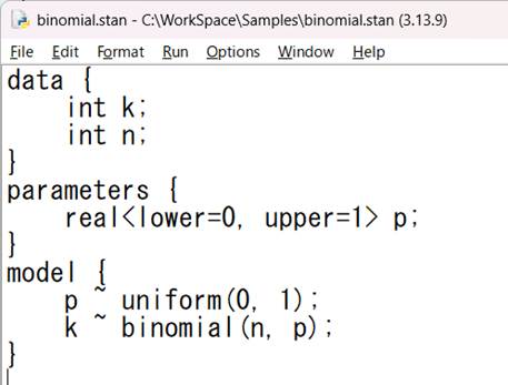 は、Stanを用いればシミュレーションで生成した乱数により推定できる。図E1に、Stanスクリプトの例を示す。