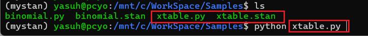 コマンドlsを実行して、カレントディレクトリにリストE1のファイル(xtable.stan)とリストE2のファイル(xtable.py)があることを確認して、コマンド