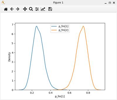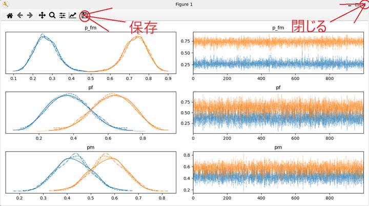 p_fmの事後分布は、p_fm[1]とp_fm[2]が明確に分かれている。