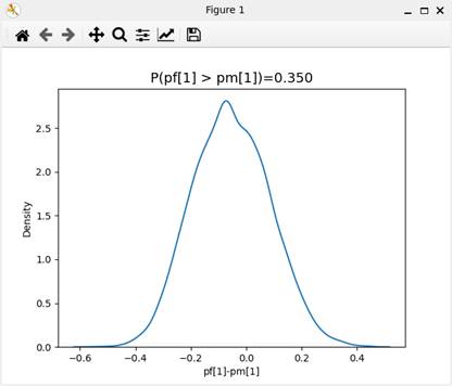 確率の差pf[1]-pm[1]の事後分布のグラフと、P(pf[1]>pm[1])の事後確率が表示されている。
