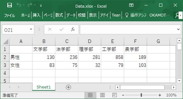 入力データファイルは、図1の形式で用意する。1行目にグループ名(図1の場合は、学部名)を設定し、1列目に2項分布のカテゴリ値(図1の場合は、「男性」と「女性」)を書く。2項分布における該当カテゴリ値(「成功」カテゴリあるいは「1」として説明されることが多い)を3行目に、非該当カテゴリ値(「失敗」カテゴリあるいは「0」として説明されることが多い)を2行目に設定する。各グループにおけるカテゴリ値の数はそれぞれの行・列のセルに設定する。