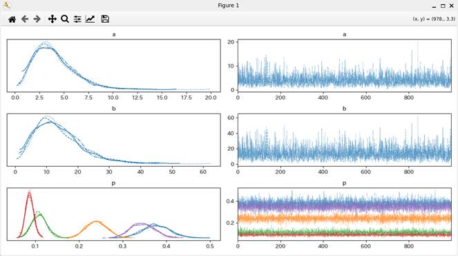 テキストファイル用ファイル名を設定して「save」ボタンをクリックすると、入力データファイルが読み込まれて処理が始まる。Stanスクリプトのコンパイルに多少時間が掛かるが、コンパイル後、MCMCサンプリングが始まる。MCMCサンプリングが終了すると、トレース図が表示される(図5)。