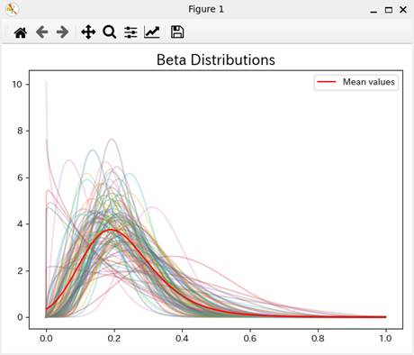 式(2)のベータ分布のグラフの事後分布である。MCMCサンプルからaとbのサンプルをランダムに100対選び、各対をパラメータとするベータ分布のグラフを描いたものである。赤の太い実線で描かれた曲線は、それら100本の曲線を平均したものである。