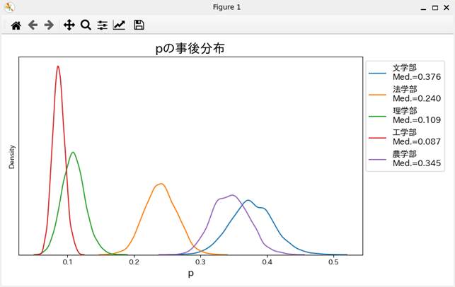 の事後分布のグラフである。女子の比率に対応する2項分布の確率の事後分布は、工学部と理学部、法学部、農学部と文学部の3グループに分かれていることが表されている。