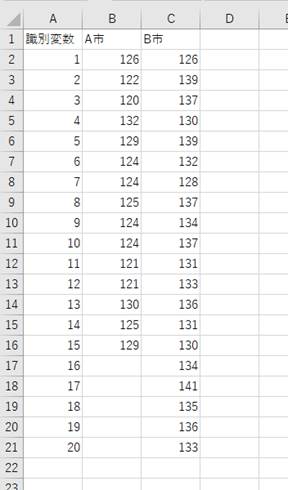 データの形式は、1行目に変数名を書き、2行目以降にデータ値が書かれている。第1列は各データの識別用で数値でも文字列でもよい。2列目に第1グループ(図1の場合はA市)のデータを書き、3列目に第2グループ(図1の場合はB市)のデータを書く。人数が揃わないときは、少ない方のデータは欠損値として空欄にしておく。