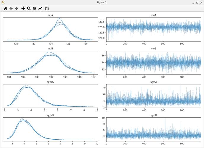 画像は複数枚保存されるので、図4のダイアログウィンドウで設定した名前を基に複数の名前が作成されて保存される。設定した名前が図4のように「MyFig.png」であれば、「MyFig_XXX.png」という形式の名前(XXXの部分は図によって変わる)で画像が保存される。保存ファイル名を設定して「Save」ボタンをクリックすると、Stanスクリプトのコンパイルが始まる。コンパイルは多少時間が掛かる。コンパイル後、MCMCサンプリングが始まる。サンプリングが終了すると、トレース図が表示される(図5)。
