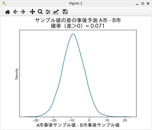2つの群(A市とB市)からそれぞれランダムにサンプルを採り、その差を求めたものである。2つの群は、パラメータ値が事後分布から取られた値である正規分布に従うものとしてシミュレーションによって求めている。スクリプトは次のようである。
