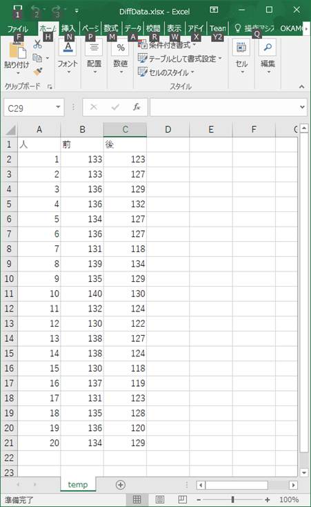 図1のデータでは、1行目に変数名が書かれ、データは2行目以降に書かれている。1列名は、データの識別用で、図1では通し番号であるが、文字列でもよい。2列目と3列目に各対