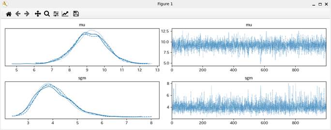 「Save」ボタンをクリックすると、Stanスクリプトのコンパイルが始まる。コンパイルには、多少時間が掛かる。コンパイル後、MCMCサンプリングが行われ、終了後、トレース図が表示される(図5)。