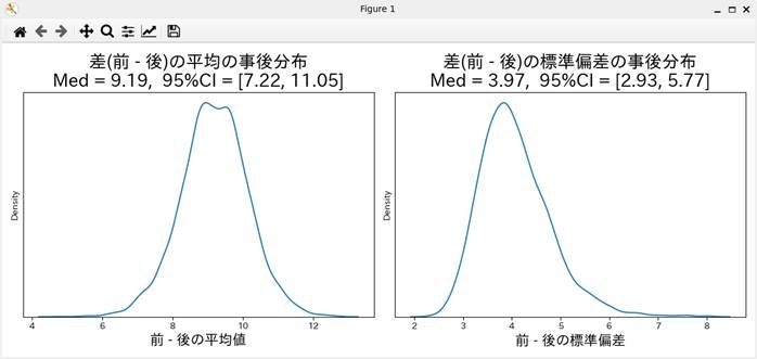 左のグラフは差の平均の事後分布である。事後分布が0の右側にあり、95%確信区間は0を含んでいない。差の平均は正の値であり、健康法を1カ月行うと血圧が下がったと言える結果である。