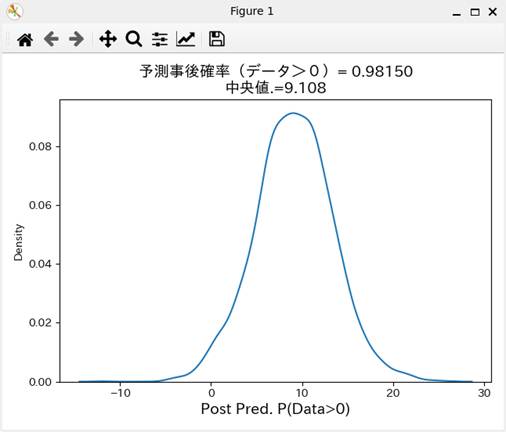 予測事後サンプル値が正である事後予測確率は0.98であり、事後予測値の中央値は9.1である。