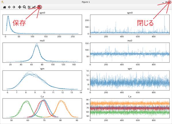 保存画像ファイル名を設定して「Enter」キーを押すと、データが読み込まれ、Stanスクリプトのコンパイルが始まる。コンパイルに多少時間が掛かる。コンパイル後、MCMCサンプリングが始まり、終了後、トレース図が表示される(図2)。