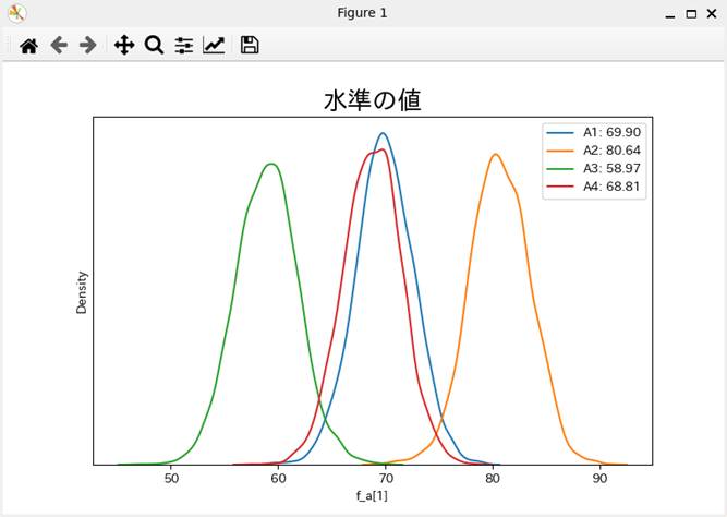 水準の値f_a[j]の事後分布のグラフである。グラフのラベルに表示されている値は、事後分布の中央値である。事後分布の代表値として、Gelman et al.(2021)は、平均値より安定しているとして中央値を勧めている。