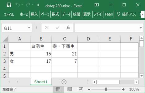 入力データファイルは、図1の形式で用意する。第1行目に、列条件のカテゴリ(図1の場合は、「自宅生」、「寮・下宿生」)を書き、第1列目に行条件のカテゴリ(図1では「男」、「女」)を書く。度数データは2行目以降、2列目から該当するセルに書く。列条件あるいは行条件は図1のものより多くてもよい。列および行条件の個数は2以上であればよい。