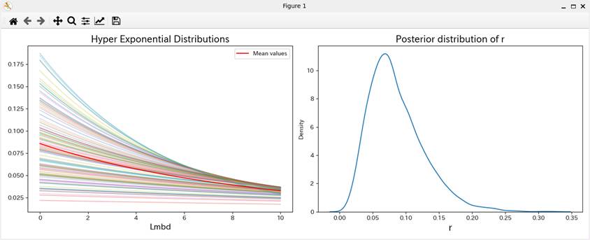 図6の左側のグラフは、MCMCサンプルからランダムにrを100個選び、各rに対する指数分布のグラフを描いたものである。100本のグラフの平均値を赤の太い曲線で表している。スクリプトを以下に示す。