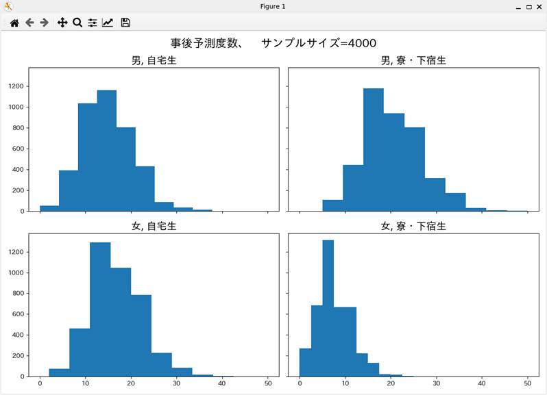 fig.suptitle(f'事後予測度数、 サンプルサイズ={s_size}',