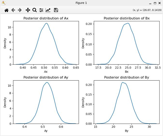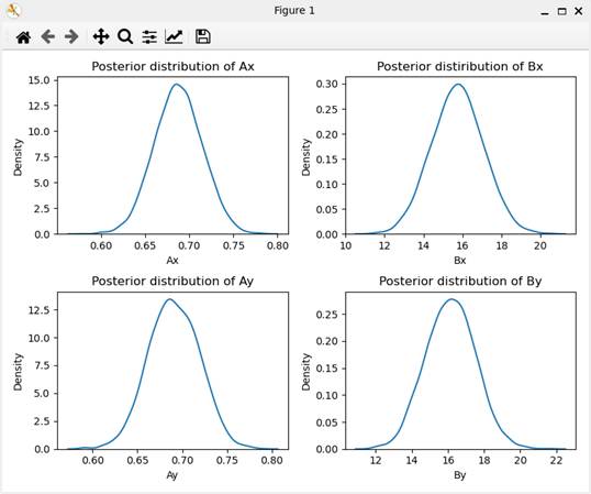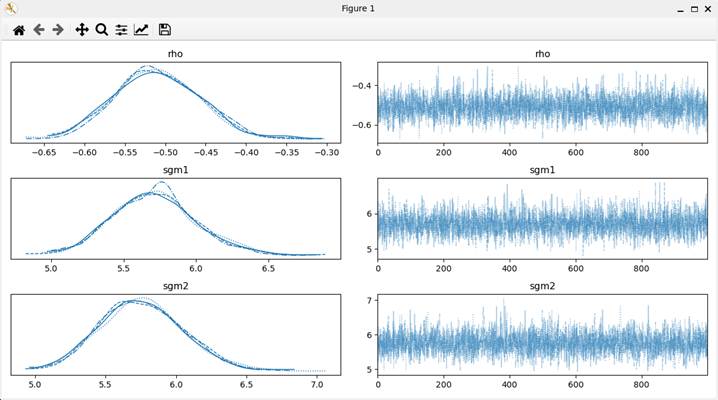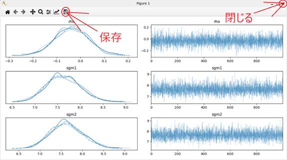 ファイル名が設定されると、Stanスクリプトのコンパイルが始まる。コンパイルには、多少時間が掛かる。コンパイルが終了すると、MCMCサンプリングが始まり、終了すると、トレース図が表示される(図3)。