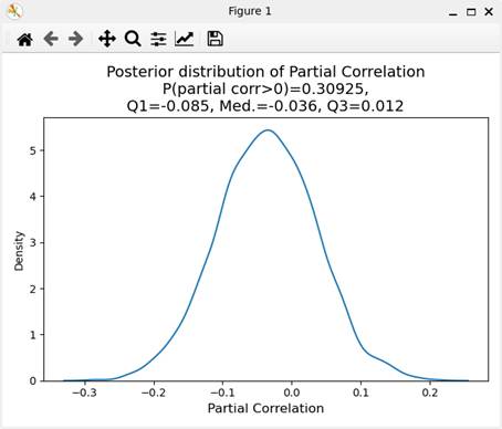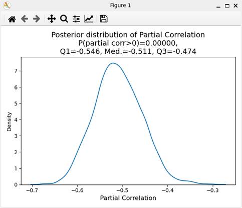 偏相関係数の事後分布のグラフであるが、偏相関係数が正である事後確率は、0.00000と表示されている。事後分布の中央値は、―0.511である。偏相関係数は、負であると言えそうである。