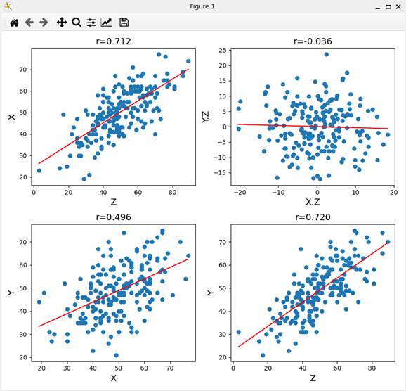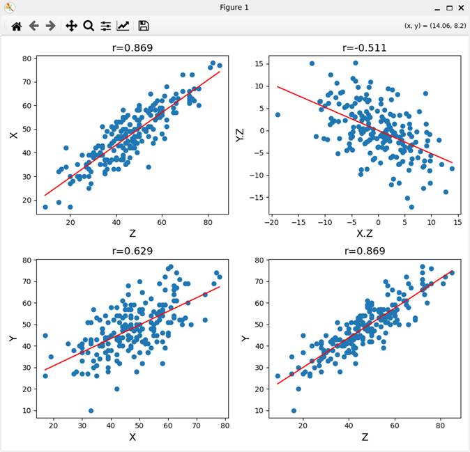 左下の(X,Y)の散布図では、相関係数は0.629であり、回帰直線は右上がりの直線である。変量Zの影響を除いた点(X.Z、Y.Z)の散布図では、偏相関係数はー0.511で、回帰直線は右下がりの直線である。
