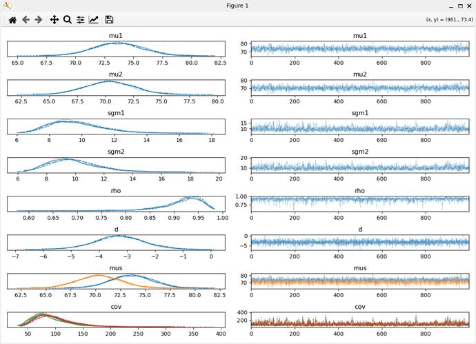 左側に事後分布のグラフ、右側にMCMCサンプリングのトレース図が表示されている。