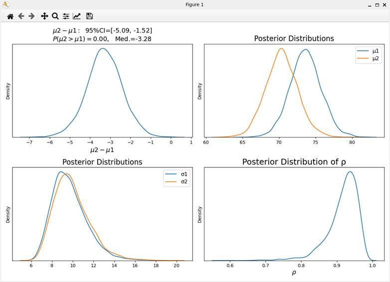 左上に平均値の差mu2―mu1の事後分布のグラフが表示されている。95%CIは、負の領域にある。事後確率P(mu2>mu1)は0.00であり、mu1の方がmu2より大きいと言える。差mu2―m1の事後分布の中央値はー3.28である。
