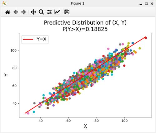 赤色の直線は、Y=Xを表しているので、この直線より上にあるデータは、Y>Xが成り立っている。この予測事後確率は、タイトル欄に