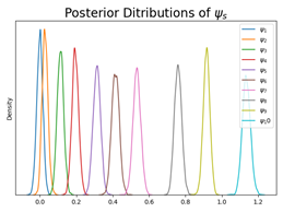 入力データファイル名(上の場合は、DataL.csv)を設定してEnterキーを押すと計算が始まる。StanスクリプトによるMCMCサンプリングが終了すると、図F.1のように、パラメータの事後分布が順番に表示される。