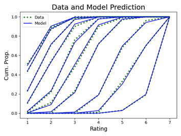 刺激は、上の行から順番に強くなるように並べる。社会的・文化的刺激(絵画など)のように、強度の順序が不明の場合は、カテゴリに仮の数値、例えば図1の例では、左から1,2,3,4,5,6,7と数値を与えて、刺激ごとに平均値あるいは中央値を求め、それに基づいて刺激の強さの順序を推測することができる。カテゴリの数値の平均値でも大まかな刺激の数量化が出来るが、さらに本ウェブサイトの分析法を用いれば、計量心理学のモデルに基づいたより精緻な分析が可能である。社会的・文化的刺激をカテゴリ数値の平均値で順序付けたときは、図1の第1欄の刺激値には例えば順番に1から整数値を当てはめておけばよい。この数値はグラフを描くときに用いられるが、分析の結果
