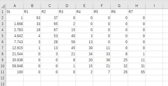 には影響しない。刺激値を横軸に取ったときのグラフは、第1列に設定された数値が横軸の値になるので、刺激値と感覚量が単調関係にあると、見やすいグラフになる。刺激値に対する感覚量は、スクリプトの出力ファイルを見れば分かる。