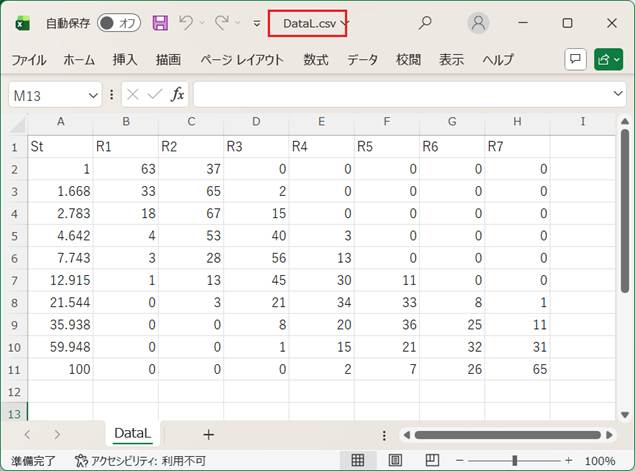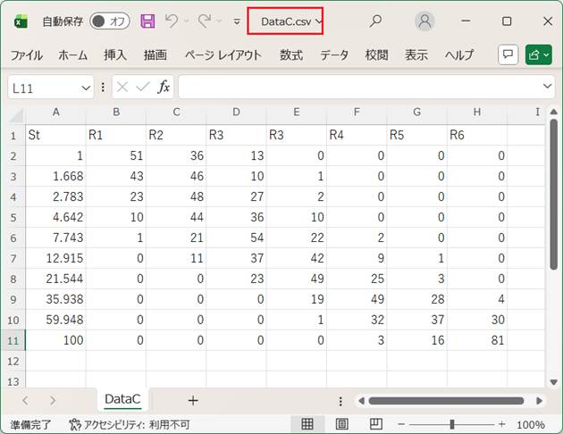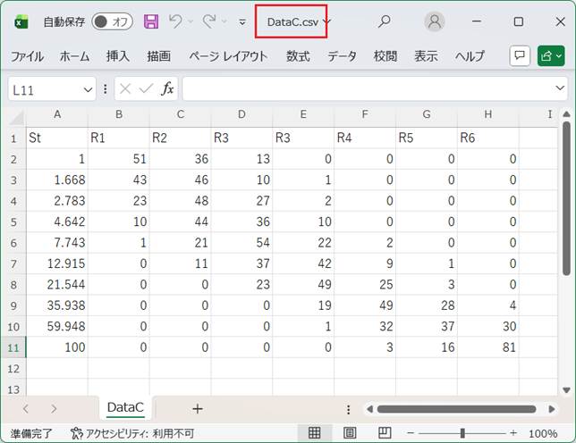 上の例では、入力データファイル名としてDataC.csvを設定している。これは、図F1に示すものである。データの設定形式については、図1の説明を参照されたい。