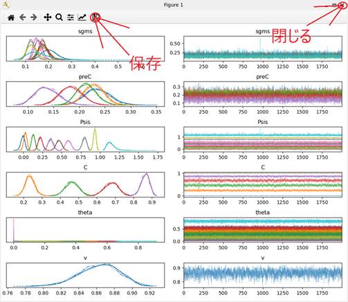 入力データファイル名を設定すると、ファイルが読み込まれ、Stanスクリプトのコンパイルが始まる。コンパイルには多少時間が掛かる。コンパイル後、MCMCサンプリングが始まり、サンプリングが終了すると、トレース図が表示される(図F2)。