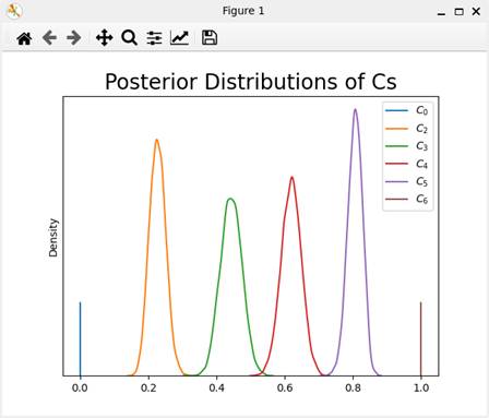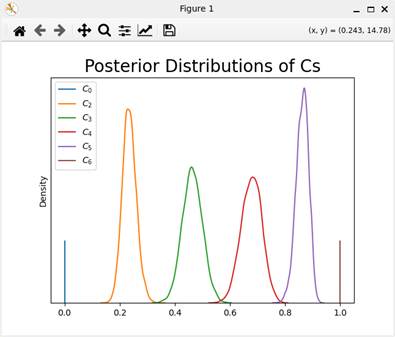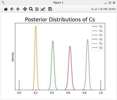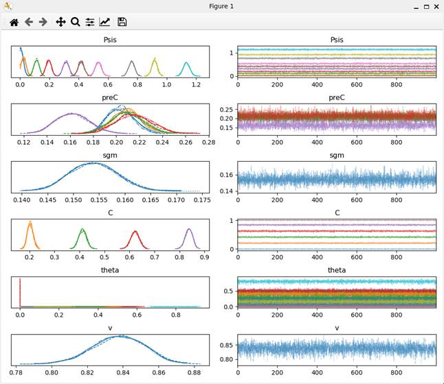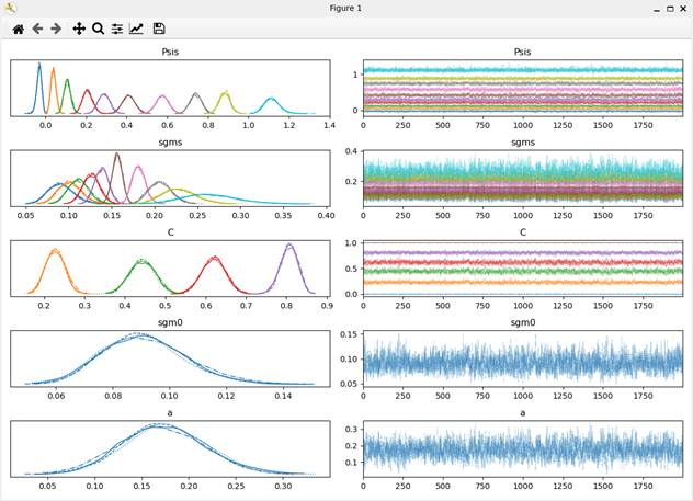 入力データファイル名を設定すると、ファイルが読み込まれ、Stanスクリプトがコンパイルされる。このコンパイルには、多少時間が掛かる。コンパイルが終了すると、MCMCサンプリングが行われ、終了するとMCMCサンプリングのトレース図が表示される(図C2)。