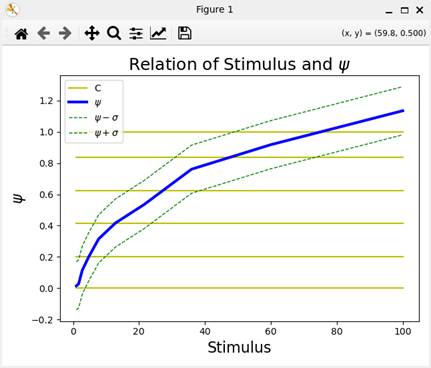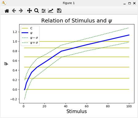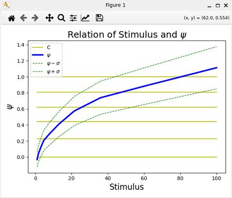 の関係が描かれている。グラフが単調増加関数でないときは、データ(図C1)の刺激値の値を感覚と単調関係にあるように設定し直せばよい。刺激値と感覚の値は、出力ファイルに出力される。刺激値の再設定を行ったときは、行を入れ替えて、データの配列(図C1)において刺激値が昇順に並ぶようにする。