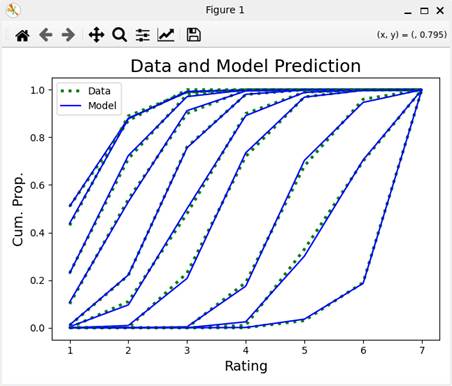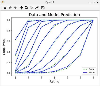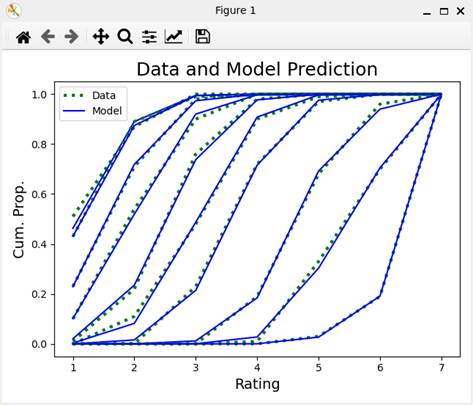 各刺激値における評定カテゴリのデータおよびモデルの累積曲線である。モデルの累積曲線は、パラメータの事後分布の中央値をパラメータの点推定値(Gelmanら、2021)として描かれている。
