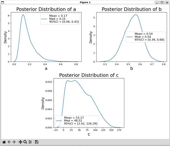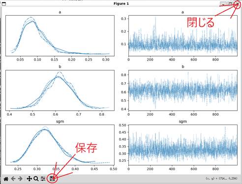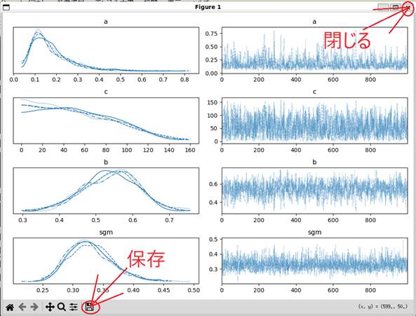 出力ファイル名を設定すると、入力データが読み込まれ、リストG1のStanスクリプトのコンパイルが始まる。このコンパイルは、多少時間が掛かる。コンパイル後、MCMCサンプリングが行われ、サンプリングが終了すると、トレース図が表示される(図G2)。