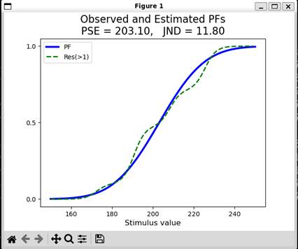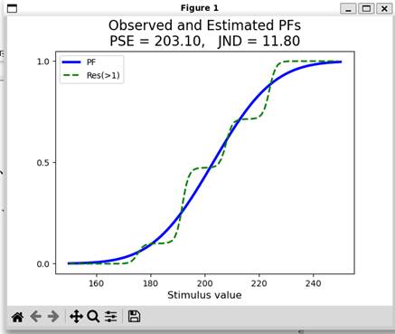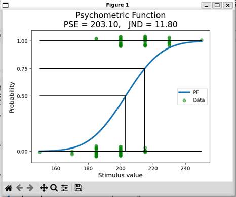 図4のWindowを閉じると、次に心理測定関数PFとデータ値のグラフが中央値(Median)を点推定値とするPSEとJNDの推定値とともに表示される(図5)。PFはこれらの中央値による推定値に基づいて描かれている。