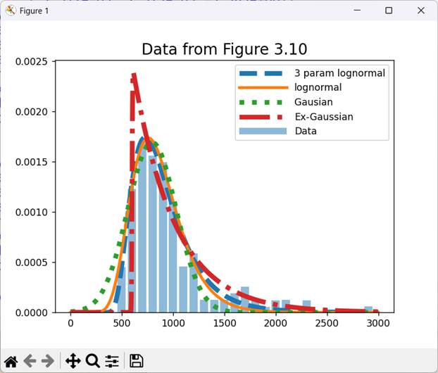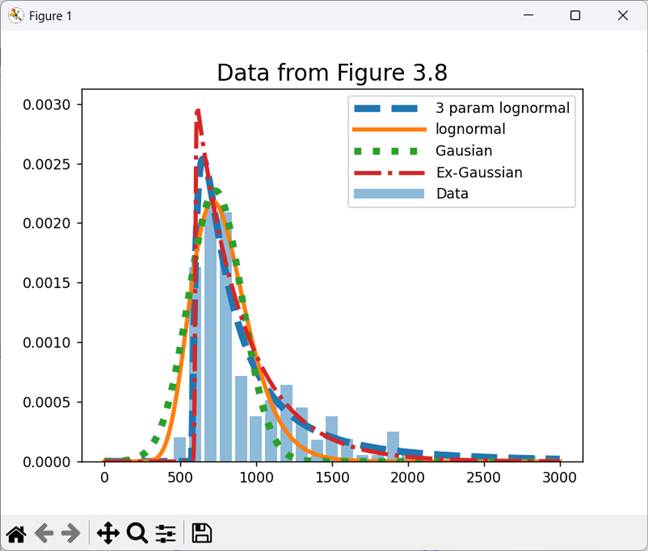 データの分布が非対称であるので、緑の点線で示されている正規分布の当てはまりは良くない。橙色の曲線で示されている対数正規分布のグラフは、正規分布よりはデータへの当てはまりが良いが右裾の分布への当てはまりは良くない。赤色の1点破線で描かれているEx-Gaussian分布は全体としてデータの分布に良く当てはまっているように見えるが、モードでの値が高すぎる。これらに対して緑色破線で示されている3パラメータ対数正規分布は、全体としてデータに良く当てはまっているようである。