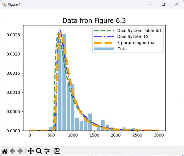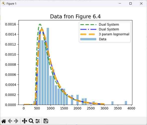 Dual Systemモデルのパラメータは、三ヶ尻(2017)の表6.1の値を用いたものを緑の破線で、最小2乗の基準で極値探索法(Powell法)により求めた値によるものを青の1点鎖線で示した。表6.1の値による緑色の破線はデータに対して少し左寄りであるが、Powell法による値の青の1点鎖線と3パラメータ対数正規分布のグラフはほぼ重なっていて、データの分布をよく表していると言える。