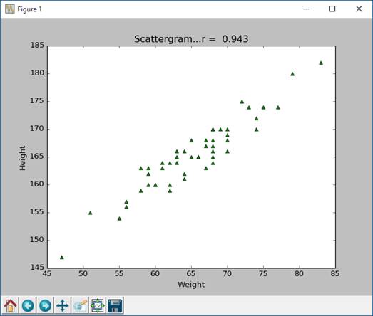 また、上のプログラムScatterF.pyでは、散布図の点が緑色の三角形で描かれるように、第3パラメータの値が「'g^’」となっている。