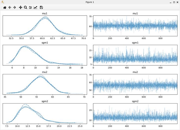 MCMCサンプリングが終了すると、トレース図が表示される(図2)。