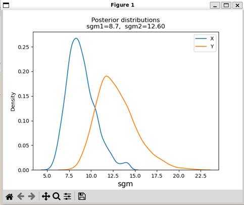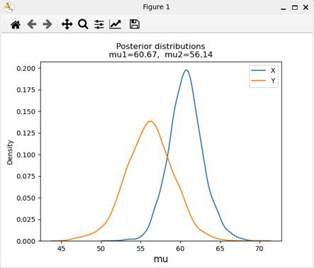 図2のWindowの右上角のX印アイコンをクリックして閉じると、次に、パラメータmu1とmu2の事後分布が表示される(図3)。