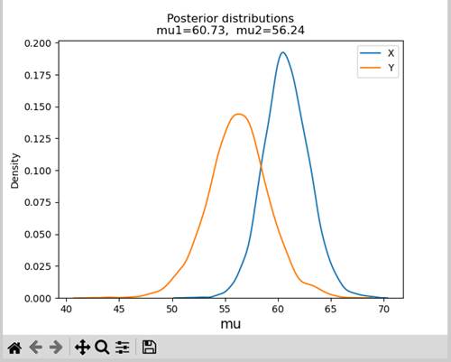 上のスクリプトは、パラメータmu1とmu2のサンプルを取り出して事後分布のグラフを描くものである。