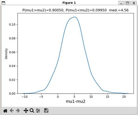 パメータの差mu1-mu2の事後分布のグラフである。mu1-mu2の正である確率が90%であるので、かなりの確信をもってmu1-mu2が正であると言える。